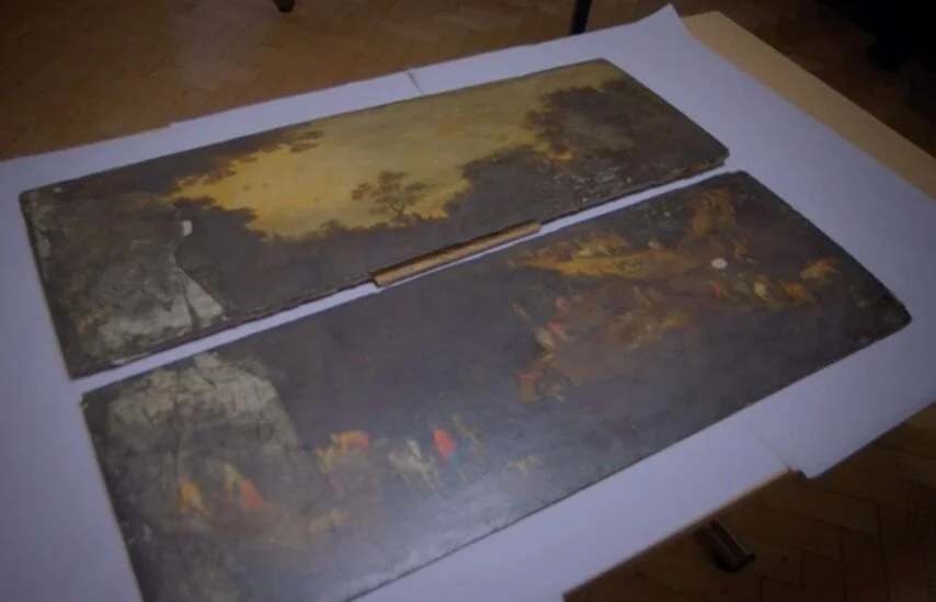 On arrival at the studio from Birmingham Museum, where it had been kept away from public eyes in drawer, the painting was in a sorry state: the panel had split at some point during the centuries since it was made, and here were substantial layers of dirt and a frosted varnish caused by contact with moisture. The old varnishes were degraded and discoloured a deep yellow and had become dull. The central portion of the painting was mostly overpaint, creating a heavily wooded landscape. Evidently, someone had thought that they could better the existing picture. The painting was in no state to be displayed, and although it was titled “Autumn” it was very difficult to determine what lay beneath the frosted varnish. Taking paint samples and carrying out small cleaning tests revealed multiple layers of the grime of ages, yellow varnish and overpaint.