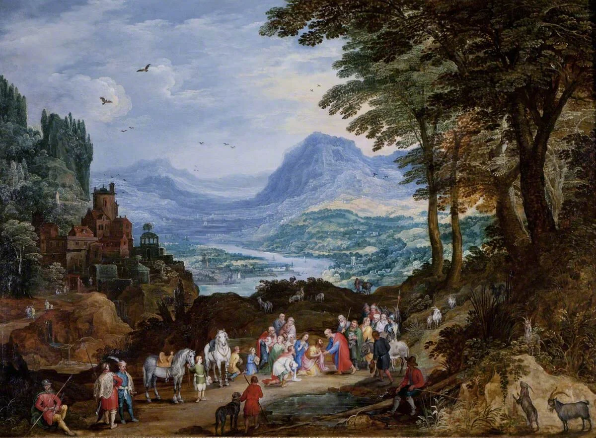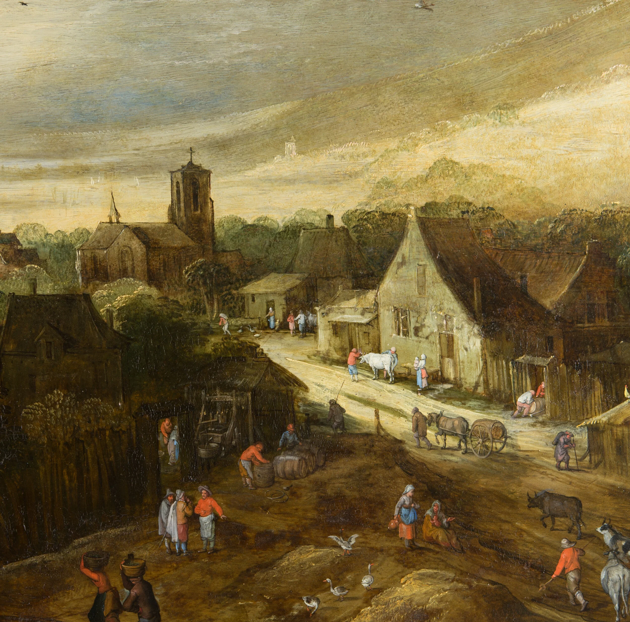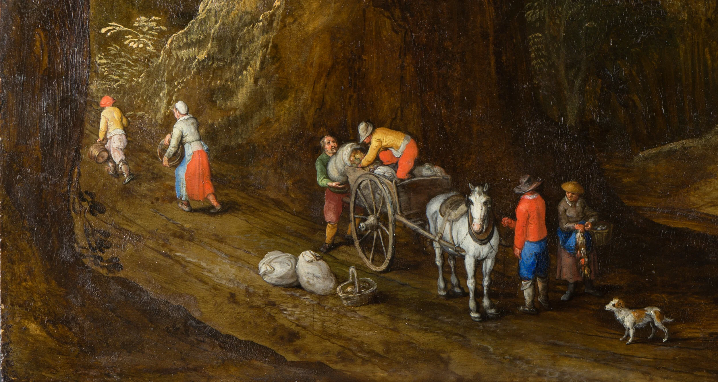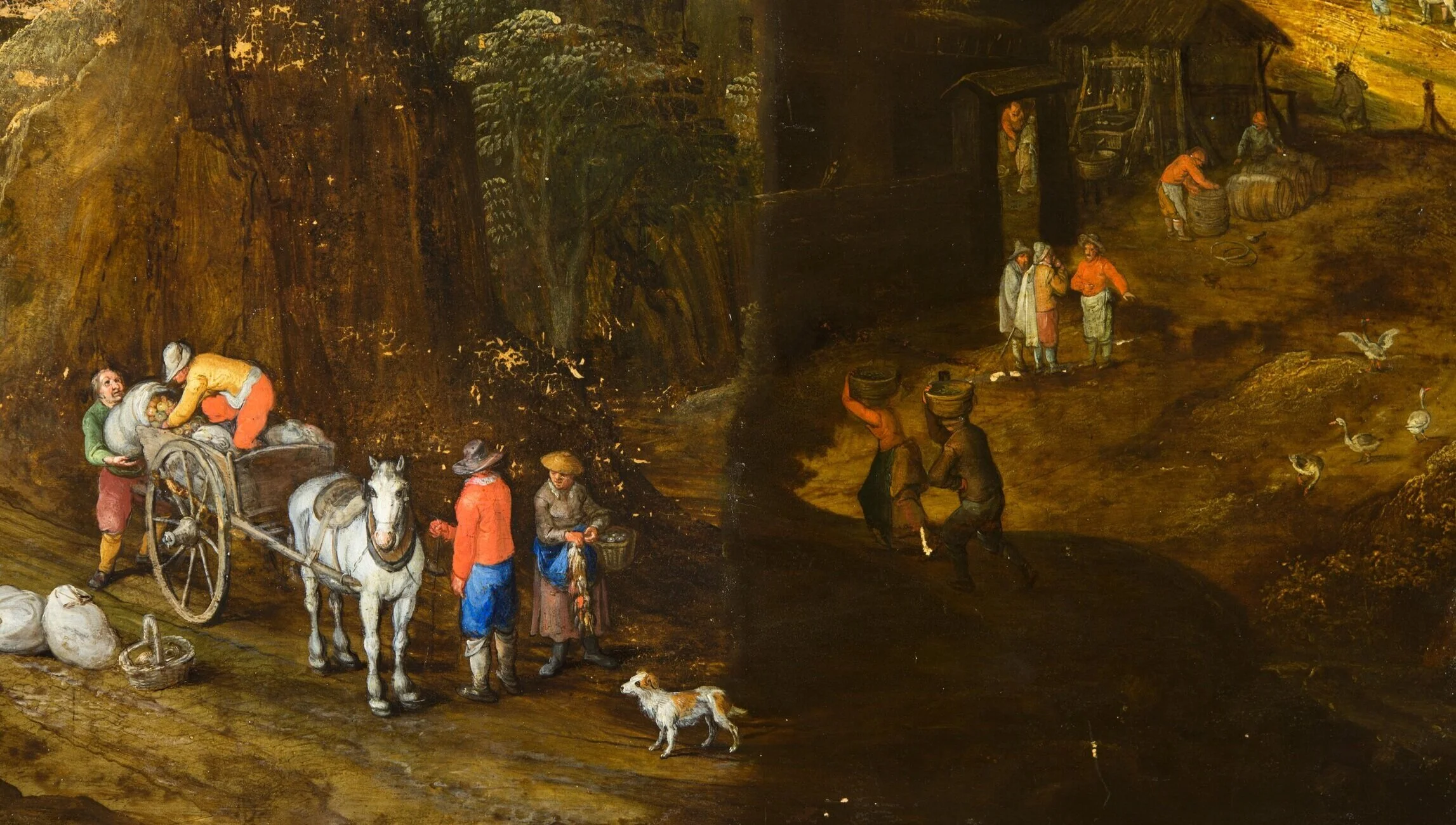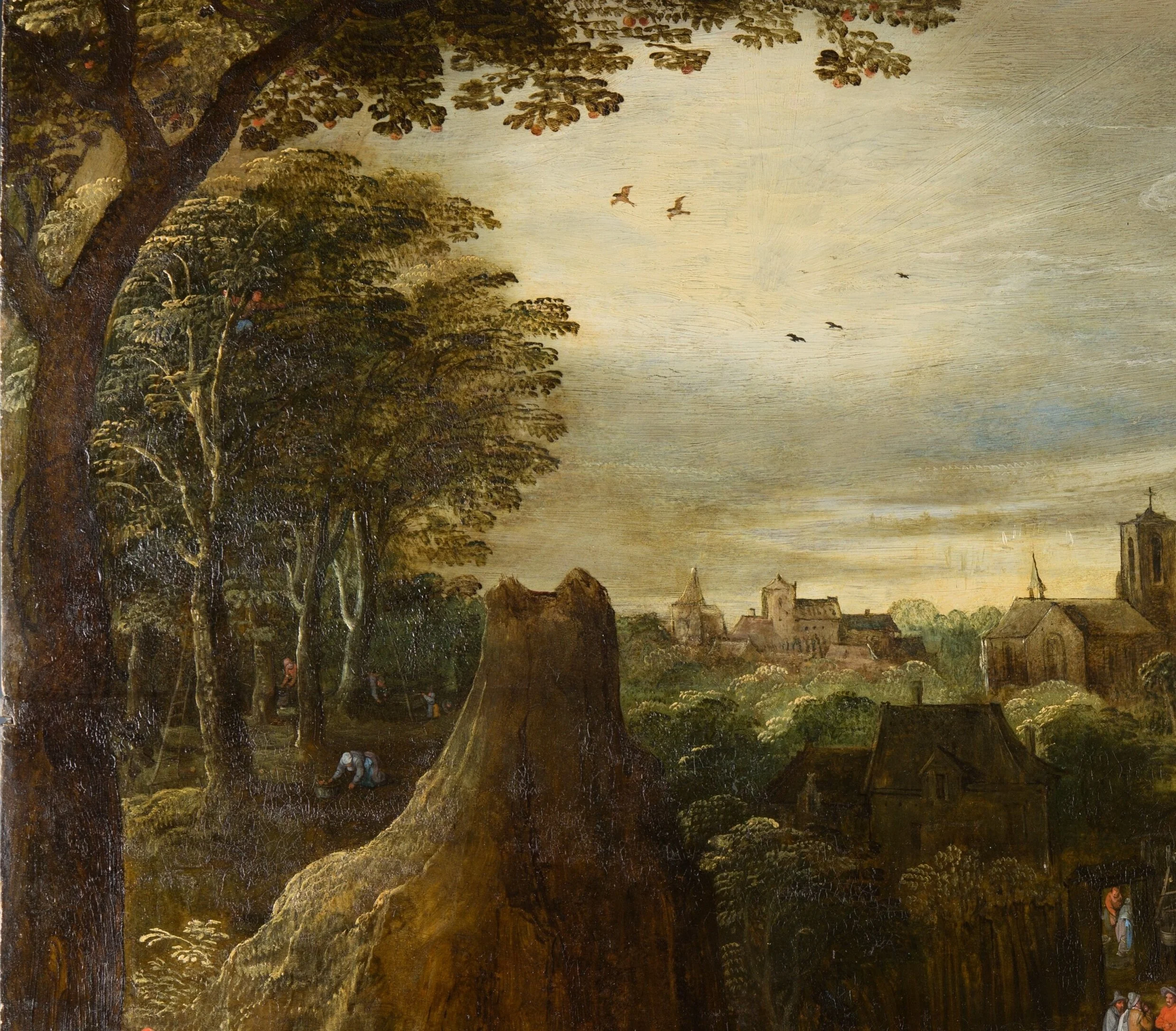 Autumn has now been dated to 1605-10 and an attribution made to two artists: the landscape by Joos de Momper (1564-1635) and the figures by the studio of Jan Breughel the Elder, possibly by the hand of Jan Breughel the Younger working in his father’s studio. Flemish artists often specialised in specific types of painting and the collaboration of portraitist and landscape painter demonstrated in Autumn is typical; exhibiting in one sublime work of art both the supreme characterisation and attention to detail of Breughel the Elder, alongside the accomplished landscape painting of de Momper.