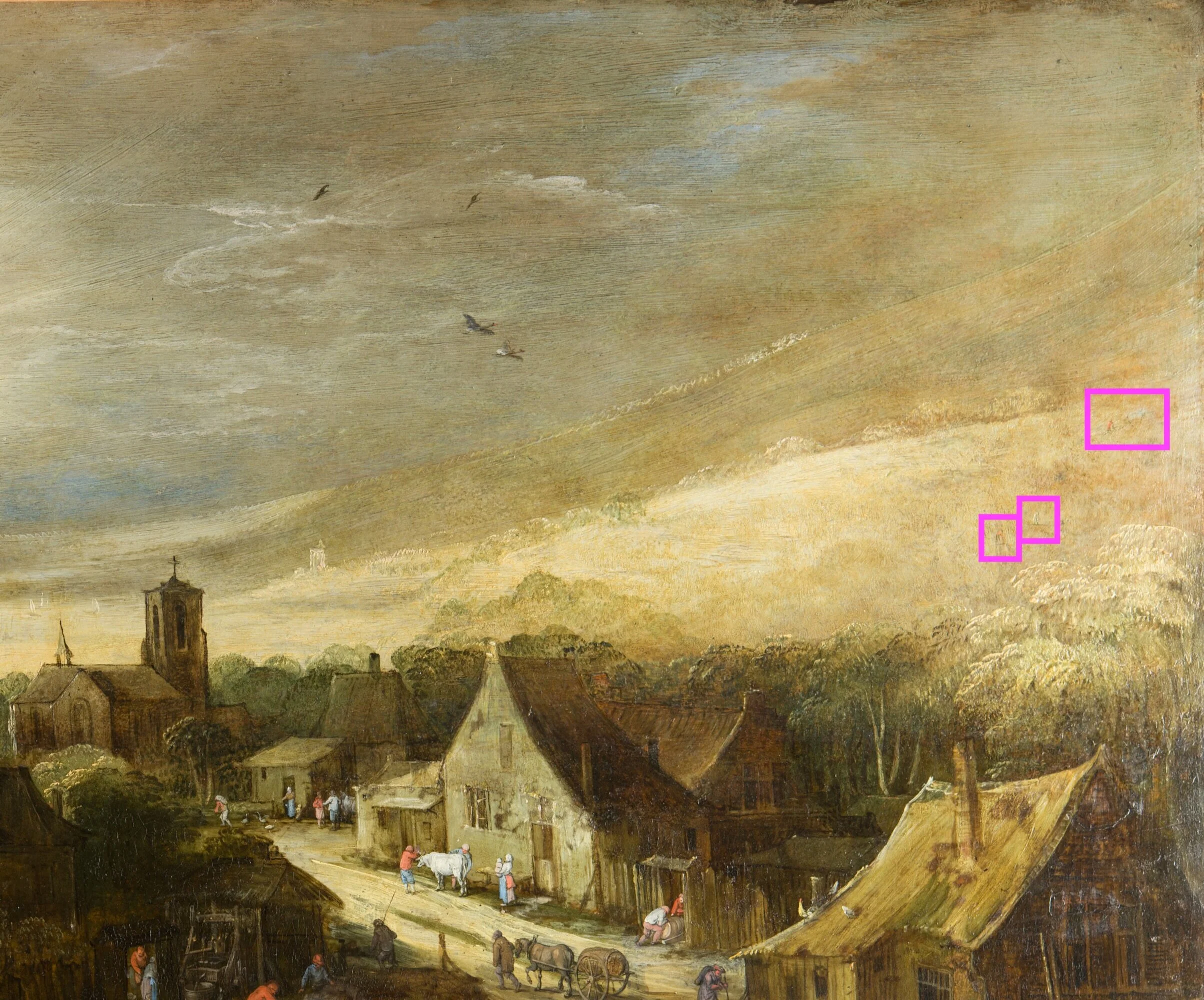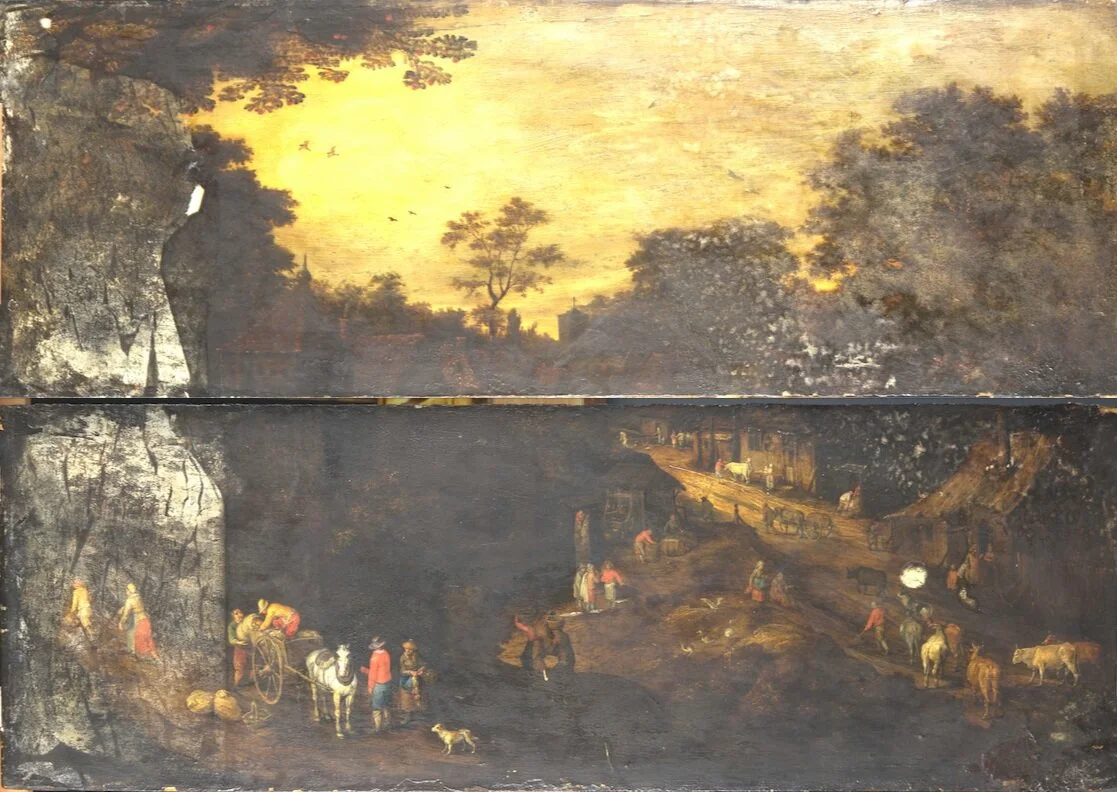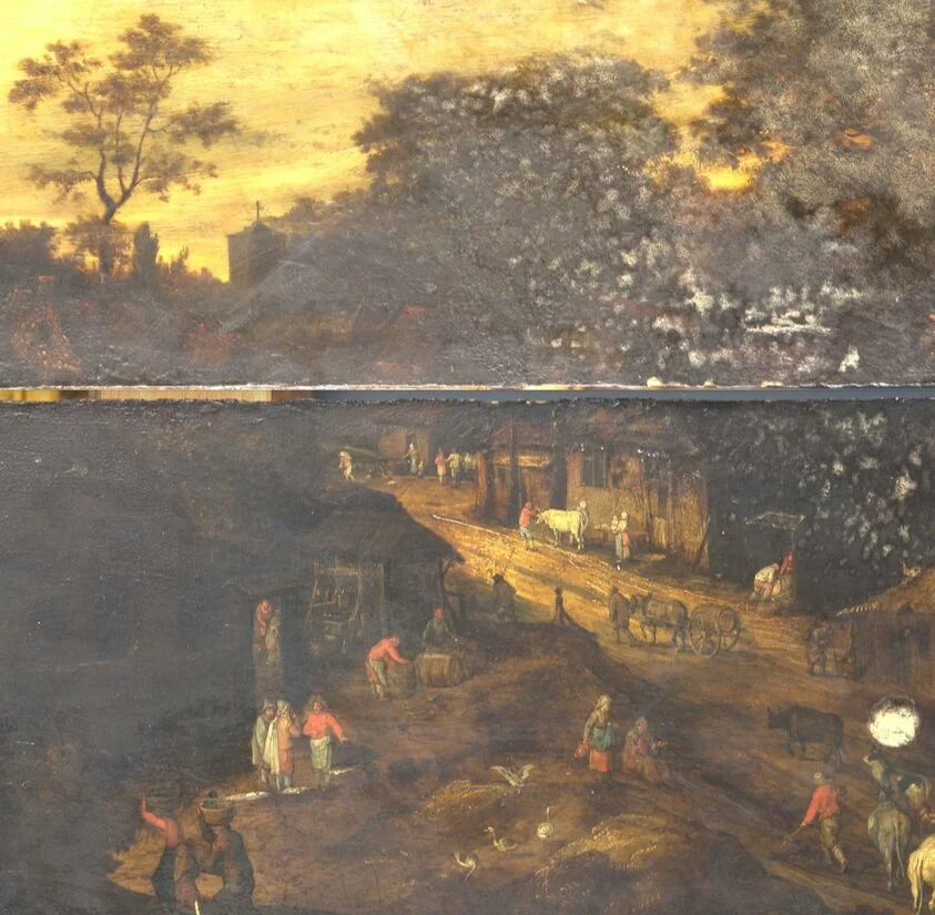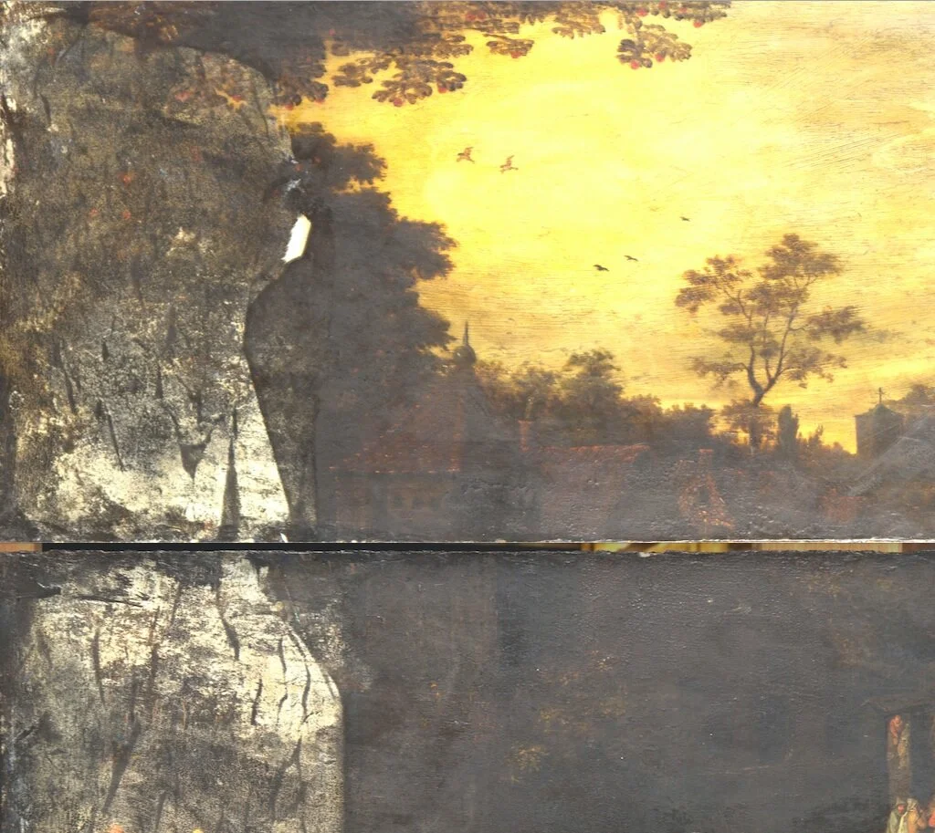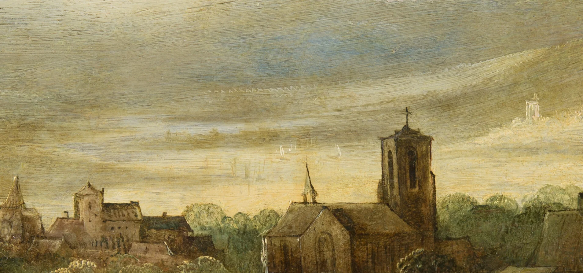 The removal of the varnish and overpaint meant that the original perspective down the road into the village can now be admired, with little groups of people engaged in lively scenes. The heavy foliage (a later addition) was removed to reveal a hillside behind the village with another church tower in the distance, and in the far distance to the left of the main church tower we see a river with sailing boats on it (see photograph below). When painting his landscapes, de Momper famously used varying tones of brown, green, and blue progressively to characterize the recession of space. Blue pigments naturally fade over time, which is why the hillside, river and sky are a yellowish-greenish-grey in the picture as we see it today.