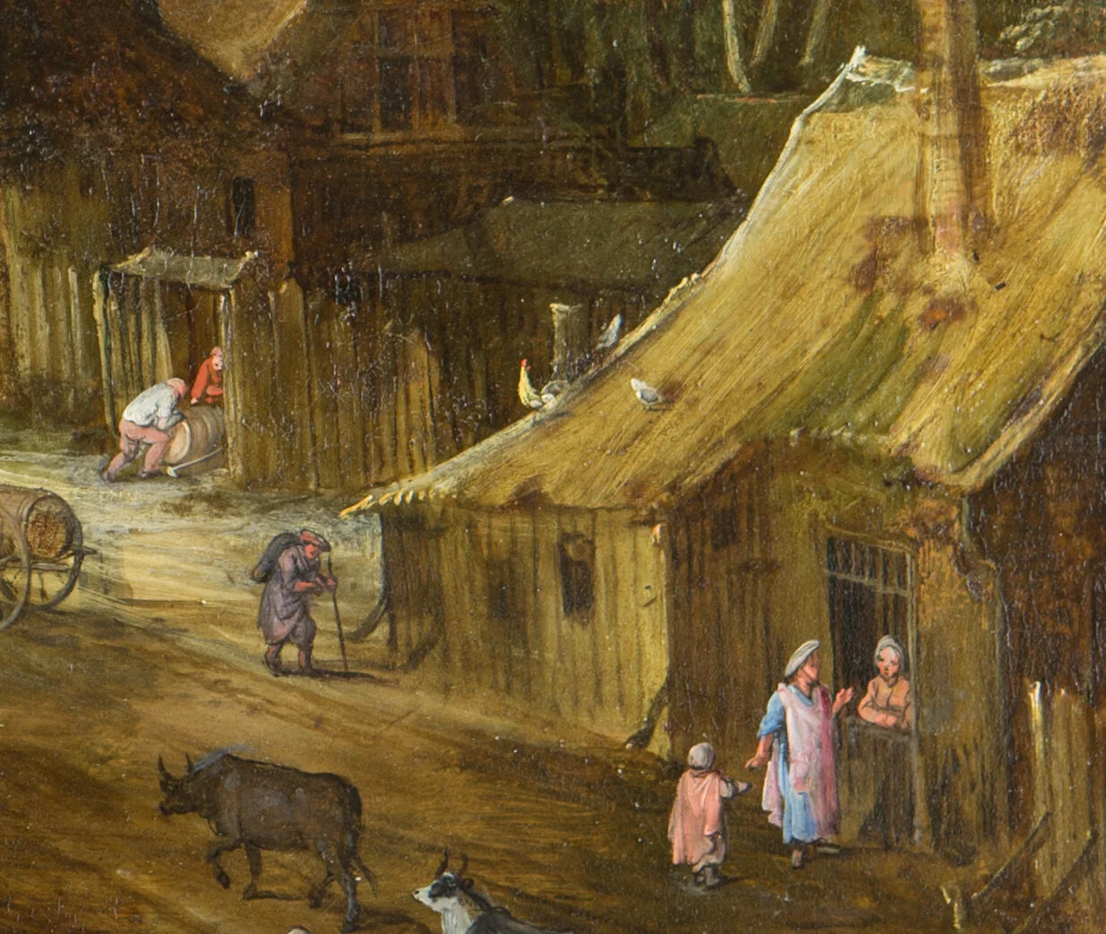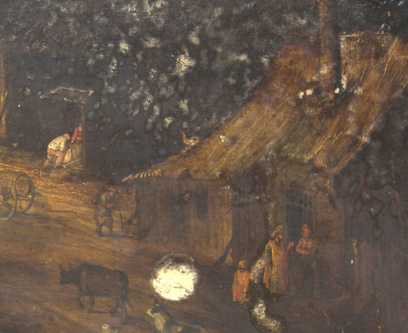 After treatment, the picture reveals in marvellous detail the lives of Flemish agricultural workers through the process of cider making; harvesting the apples, putting them through a cider press, and storing the cider in barrels.