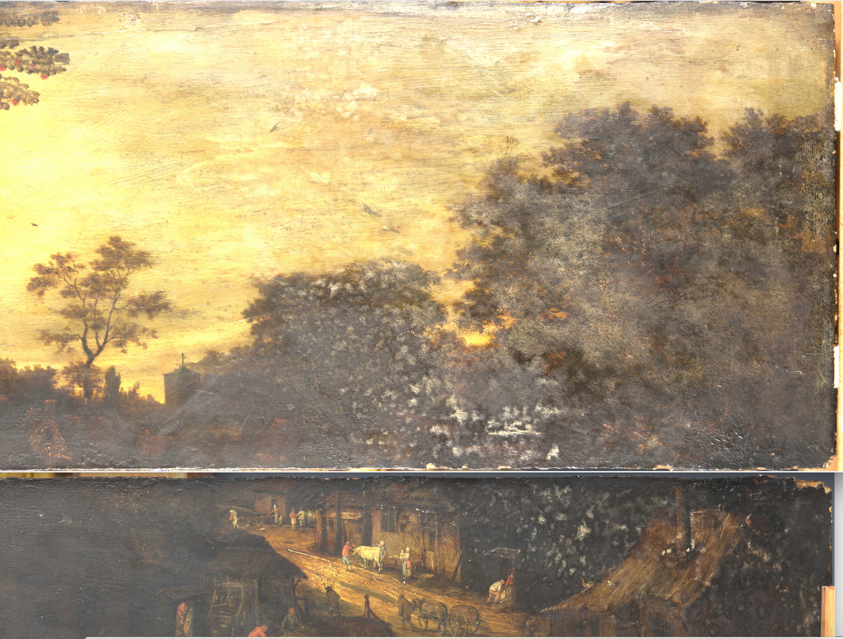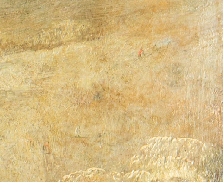 During the process of cleaning the painting and removing the added top canopy of trees, small figures were found in what we had previously thought to be the sky and which turned out to be a field on the hillside in the distant landscape (below).